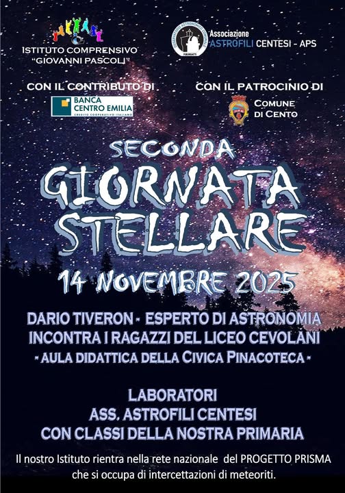 “Venerdì 14 novembre 2025, per la seconda edizione della ‘Giornata stellare’ nell’IC2 ‘Giovanni Pascoli’ di Cento, alcune classi del Liceo Cevolani parteciperanno alla conferenza tenuta da Dario Tiveron, Presidente dell’Associazione Nazionale dei Planetari e tra i massimi esperti mondiali nel campo dei planetari. Verranno inoltre realizzati laboratori didattici per alcune classi delle scuole primarie dell’ Istituto grazie alla collaborazione degli Astrofili Centesi. Infatti, l’Istituto di Cento da 2 anni è entrato a far parte del progetto PRISMA, una rete italiana di camere all-sky per l’osservazione di meteore brillanti (fireball e bolidi) che si occupa di determinare le orbite degli oggetti che le provocano e di delimitare con un buon grado di approssimazione le aree dell’eventuale caduta di frammenti per poter recuperare le meteoriti. Sul tetto della scuola primaria di Penzale è stata installata una di queste telecamere, donata dalla Banca Centro Emilia, istituto bancario del territorio che grazie anche ad un’attività sociale reinveste sul territorio in iniziative educative e divulgative. Dal sito della scuola, attraverso un link dedicato è possibile accedere alla visualizzazione di alcune immagini significative riprese dalla telecamera installata. Il percorso è nato dalla volontà della docente Rossella Calzolari e dal contributo dell’Associazione degli Astrofili Centesi, nella persona di Thomas Mazzi, e previsto dall’ampliamento dell’offerta formativa che ogni anno si rinnova e si modula sia nella scuola primaria sia nella scuola secondaria dell’IC2. Lo stesso istituto si è altresì assunto l’impegno di diventare “divulgatore scientifico” sul territorio e di promuovere la conoscenza dell’esistenza di questo potente e interessante strumento anche presso gli altri istituti scolastici, con la volontà di ampliare, ogni anno, questa opportunità coinvolgendo più classi nelle attività che vengono previste nella Giornata Stellare. Per questo anno scolastico, la Giornata Stellare – seconda edizione è prevista per venerdì 14 novembre e vedrà la partecipazione di alcune classi del Liceo Cevolani che assisteranno ad una conferenza tenuta da Dario Tiveron, Presidente dell’Associazione Nazionale dei Planetari e uno dei massimi esperti italiani nel campo dell’astronomia. Verranno inoltre realizzati laboratori didattici per alcune classi delle scuole primarie del nostro istituto grazie alla collaborazione degli Astrofili Centesi. A conclusione della mattinata , avrà luogo una Tavola rotonda degli addetti e addette ai lavori, alla quale prenderanno parte tutti coloro che hanno contribuito alla realizzazione del tema dibattuto “Progetto Stellare: rendicontazione e progettualità futura”. L’intervento della Dirigente scolastica dell’IC2 Laura Riviello: “Ringrazio di cuore tutti i soggetti coinvolti in questa fantastica avventura ed in particolare la Banca Centro Emilia che ha donato la telecamera all’Istituto scolastico, dando così ufficialmente avvio a questo percorso arricchente e stimolante per tutti i nostri ragazzi e le nostre ragazze. Grazie, inoltre, al Comune di Cento, nella persona dell’ass. Silvia Bidoli per aver preso parte all’iniziativa che, anche quest’anno, è stata patrocinata dal Comune; all’Associazione Astrofili centesi per le attività svolte con gli alunni e le alunne, nella persona di Thomas Mazzi; al docente Dario Tiveron per la sua partecipazione, alla referente del progetto scolastico Rossella Calzolari e a tutti/e partecipanti che, a vario titolo, hanno dato il loro prezioso contributo.” E’ stata un’occasione davvero stellare…”