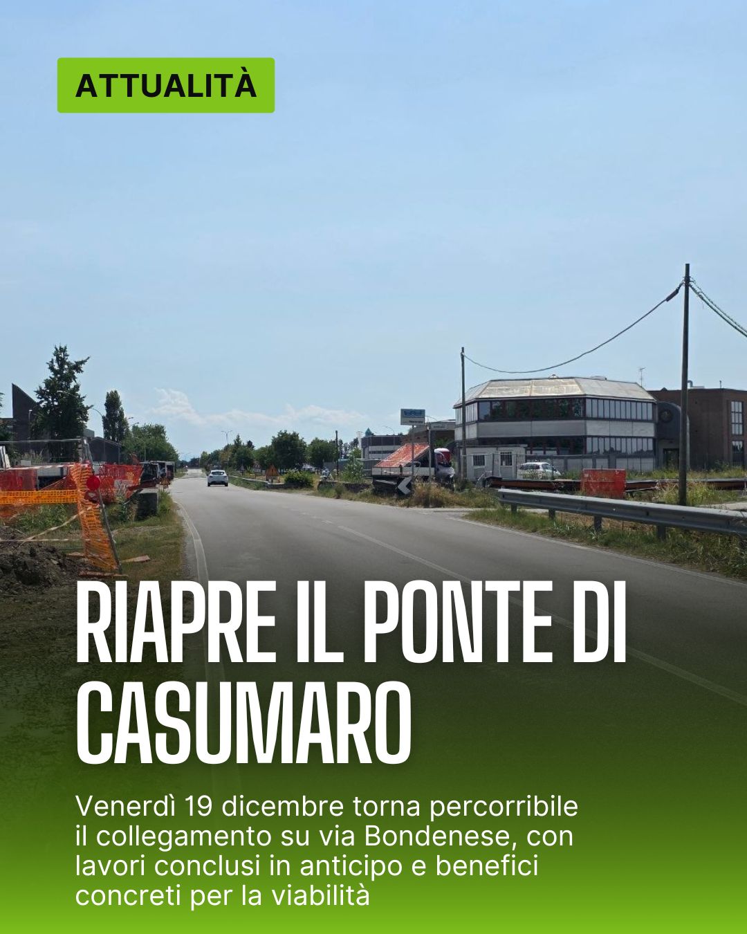 Ci sono buone notizie che non hanno bisogno di essere ingigantite, perché parlano da sole. Una di queste riguarda Casumaro: venerdì 19 dicembre 2025, alle ore 8.30, riapre il ponte su via Bondenese, dopo mesi di lavori e con un anticipo di quasi un mese rispetto ai tempi inizialmente previsti.