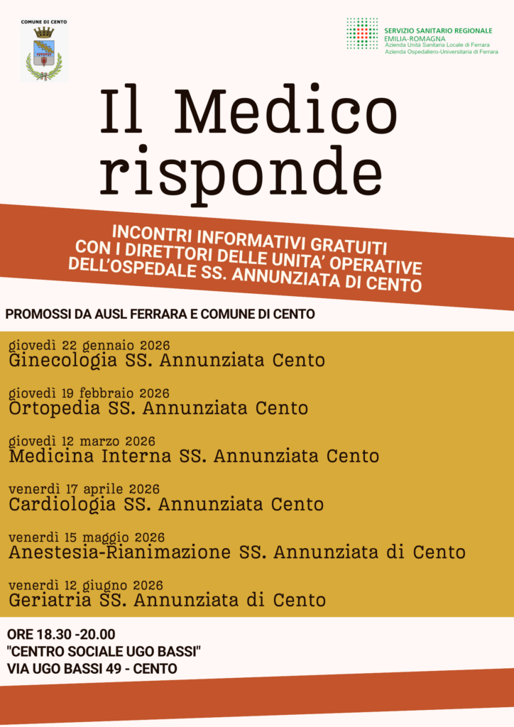 Il ciclo “Il medico risponde”, promosso dal Comune di Cento e dall’Azienda USL di Ferrara, va invece nella direzione opposta: riportare il dialogo su un piano diretto, comprensibile e verificabile. Gli incontri si tengono alle 18.30 al Centro Sociale Ugo Bassi e vedono come protagonisti gli specialisti dell’ospedale cittadino.