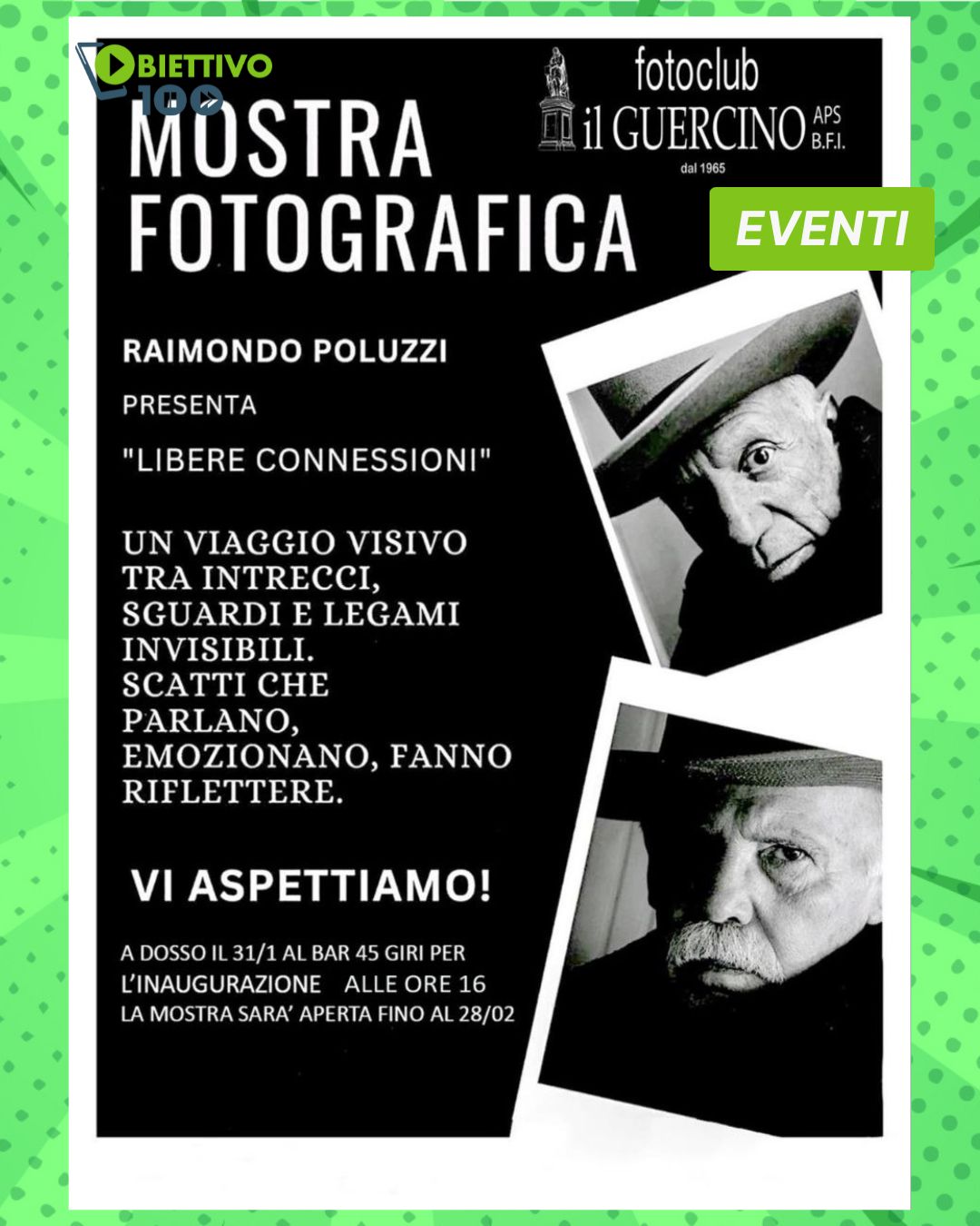 Sabato 31 gennaio alle ore 16, al Bar 45 Giri di Dosso, inaugura Libere connessioni, mostra fotografica personale di Poluzzi, visitabile fino al 28 febbraio. Un progetto che nasce come audiovisivo e che oggi prende forma sulle pareti: coppie di immagini affiancate, apparentemente lontane, che dialogano tra loro secondo logiche libere, ironiche, talvolta spiazzanti. Prima una fotografia, poi l’altra. Nella versione originaria c’era il tempo di mezzo, l’attesa; qui resta il cortocircuito mentale, affidato interamente allo sguardo di chi osserva.