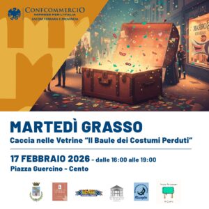 In questo scenario si inserisce l’impegno di Confcommercio Ferrara e del Comitato Commercianti Cento in Vetrina, che anche quest’anno hanno scelto di essere parte attiva del periodo più giocoso dell’anno. Con la collaborazione del Comune di Cento e della Fondazione Teatro Borgatti, è stata promossa la tradizionale Caccia al Tesoro nei negozi, in programma nel pomeriggio del Martedì Grasso, a partire dalle ore 16. Un’iniziativa pensata per famiglie e bambini, con il supporto del Tavolo dei Giovani e con una parte gastronomica curata dalla società carnevalesca Risveglio.